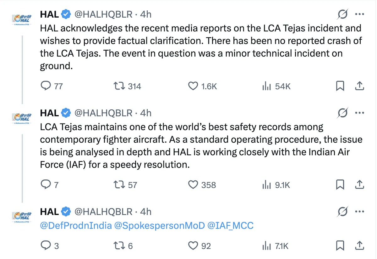 HAL ने कहा कि एयर फ़ोर्स के साथ मिलकर स्टैंडर्ड प्रोसीजर के तहत घटना का एनालिसिस किया जा रहा है। यह एक छोटी-मोटी ज़मीनी टेक्निकल घटना थी। यह सफाई इसलिए ज़रूरी है क्योंकि इंडियन एयर फ़ोर्स ने इस महीने की शुरुआत से अपने तेजस फ़्लीट का टेक्निकल इंस्पेक्शन बढ़ा दिया है, खासकर अपने तीसरे तेजस एयरक्राफ्ट के नुकसान के बाद, जो लैंडिंग के दौरान डैमेज हो गया था लेकिन पायलट को कोई चोट नहीं आई थी। दो और तेजस हादसे मार्च 2024 और नवंबर 2023 में हुए थे।
